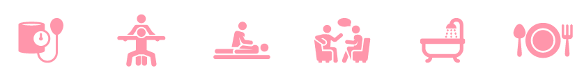 水分補給をしてから血圧と脈拍をはかります。そのあと身体機能の維持・向上を目的とした機能訓練をおこないます。